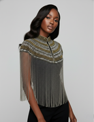 A sculptural statement designed to command attention. This beaded fringe cape features layered metallic beadwork across the neckline, forming a structured, armor-like yoke that flows into cascading strands of fine fringe. The contrast between silver and gold tones creates depth, dimension, and a luminous finish that moves effortlessly with the body.