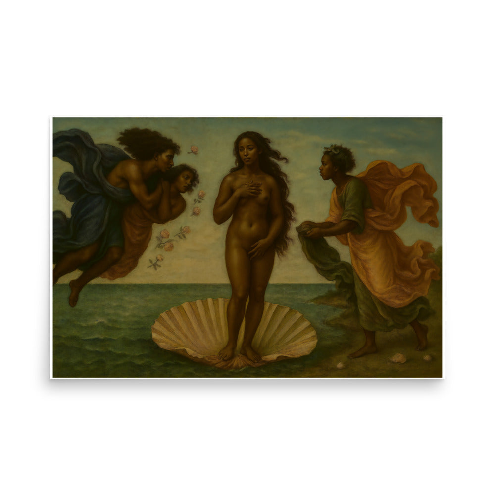 This re-imagining of The Birth of Venus celebrates beauty, emergence, and divine femininity through a contemporary Black lens.