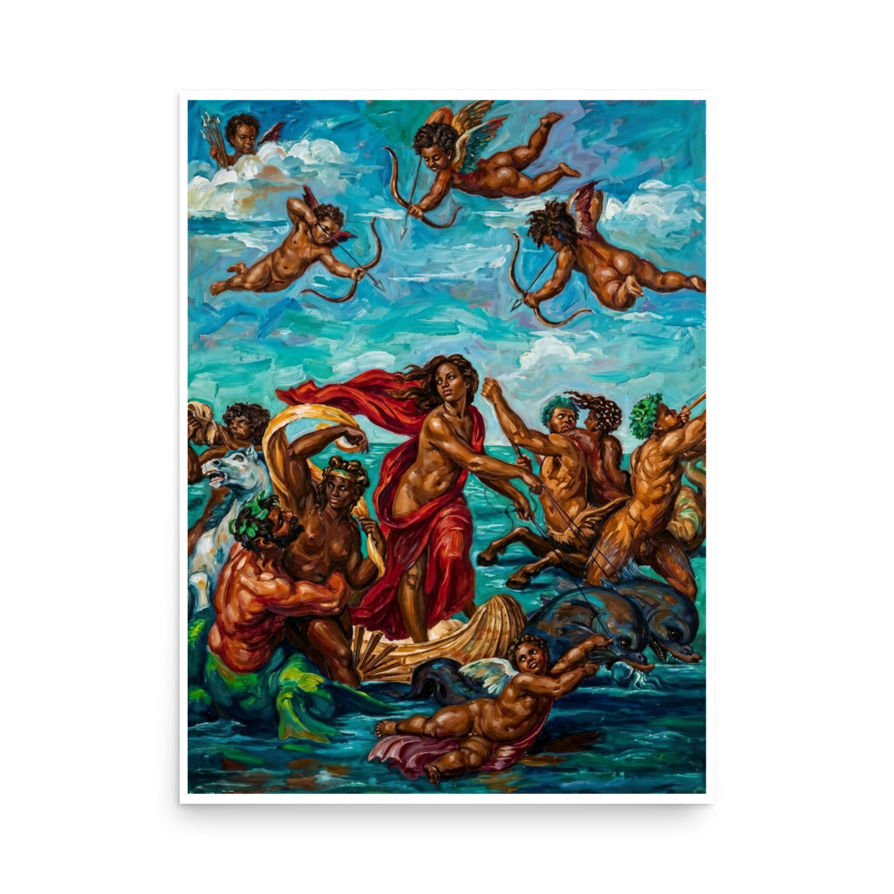 Inspired by Raphael’s original fresco, this artwork preserves the sense of motion, harmony, and idealized beauty that define the composition — from the swirling sea and airborne figures to Galatea’s commanding presence at the center of the scene. Recast with Black figures, the work transforms classical mythology into a vision of joy, power, and divine grace rooted in representation.