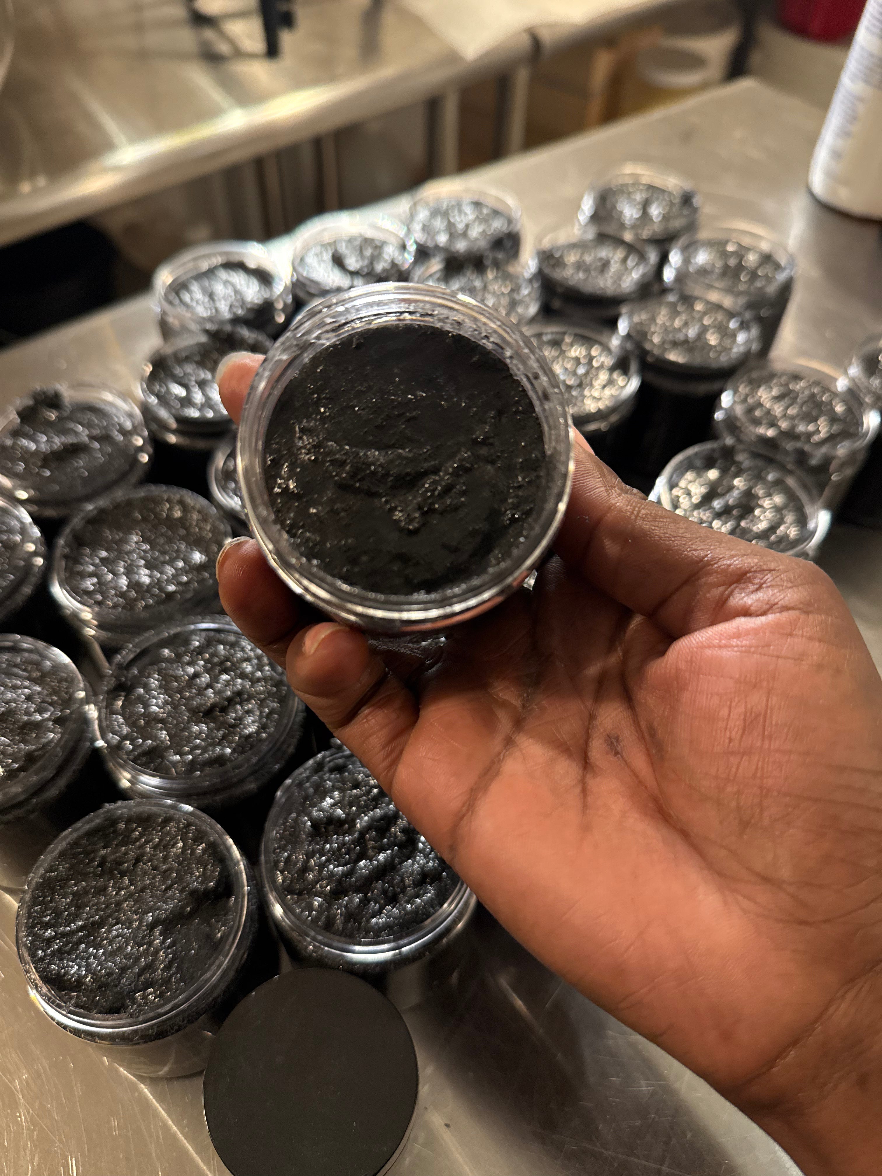 Handmade Hawaiian Black Volcanic Salt charcoal infused detoxing scrub, Black Diamonds. Created for detoxing your skin and curating a soothing musky vanilla exfoliating experience. Great for facial hair use, lip use, and overall body use to remove dead skin, toxins, and leave you smooth and soft.  to even skin tones and fade dark marks over time with its powerful plant properties and gentle exfoliation.