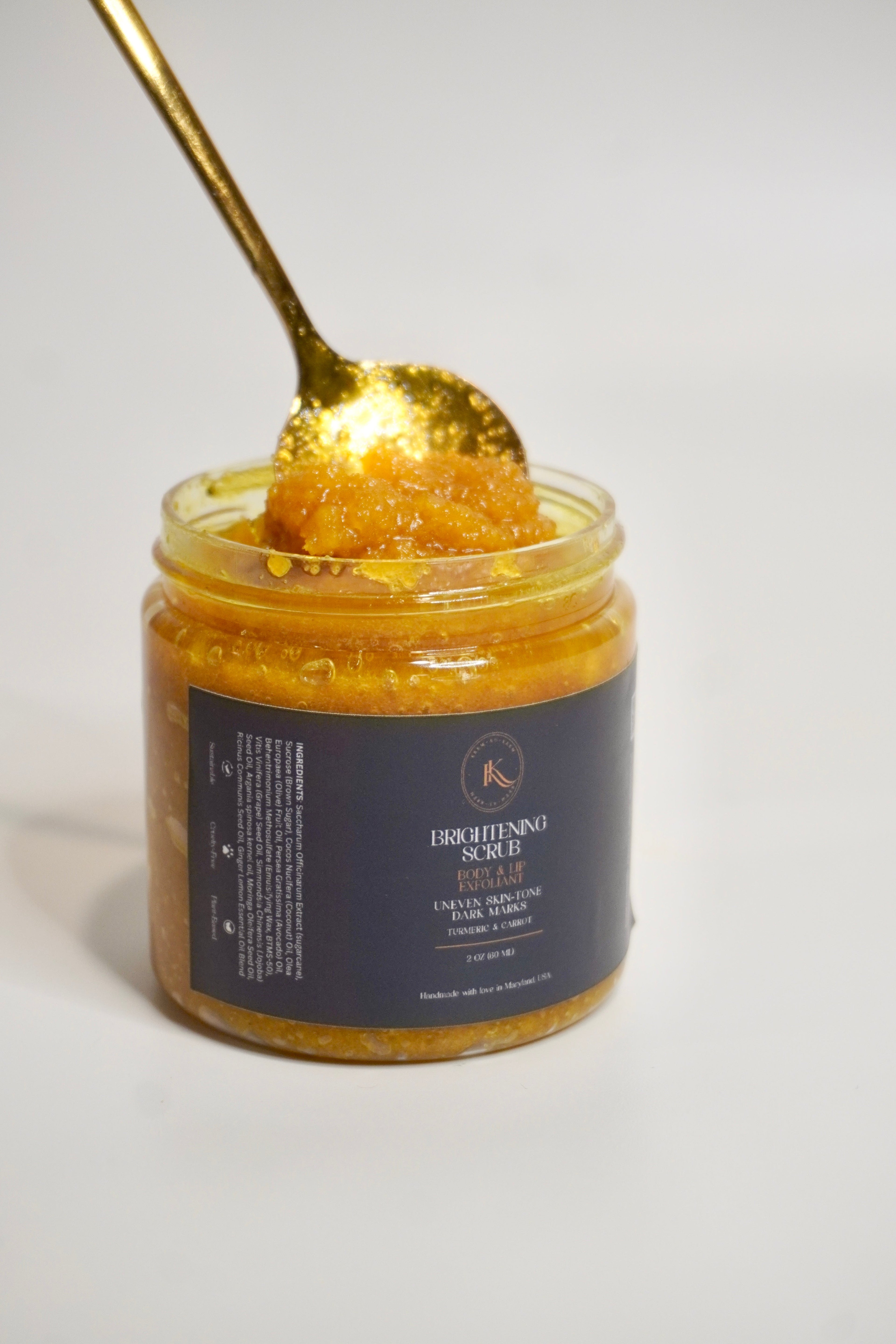 Handmade Turmeric and Carrot Powder infused Brightening Scrub. Used to even skin tones and fade dark marks over time with its powerful plant properties and gentle exfoliation. Great for smoker lips, dark underarms, bikini lines and any area you need a little pick me up, except for your face.