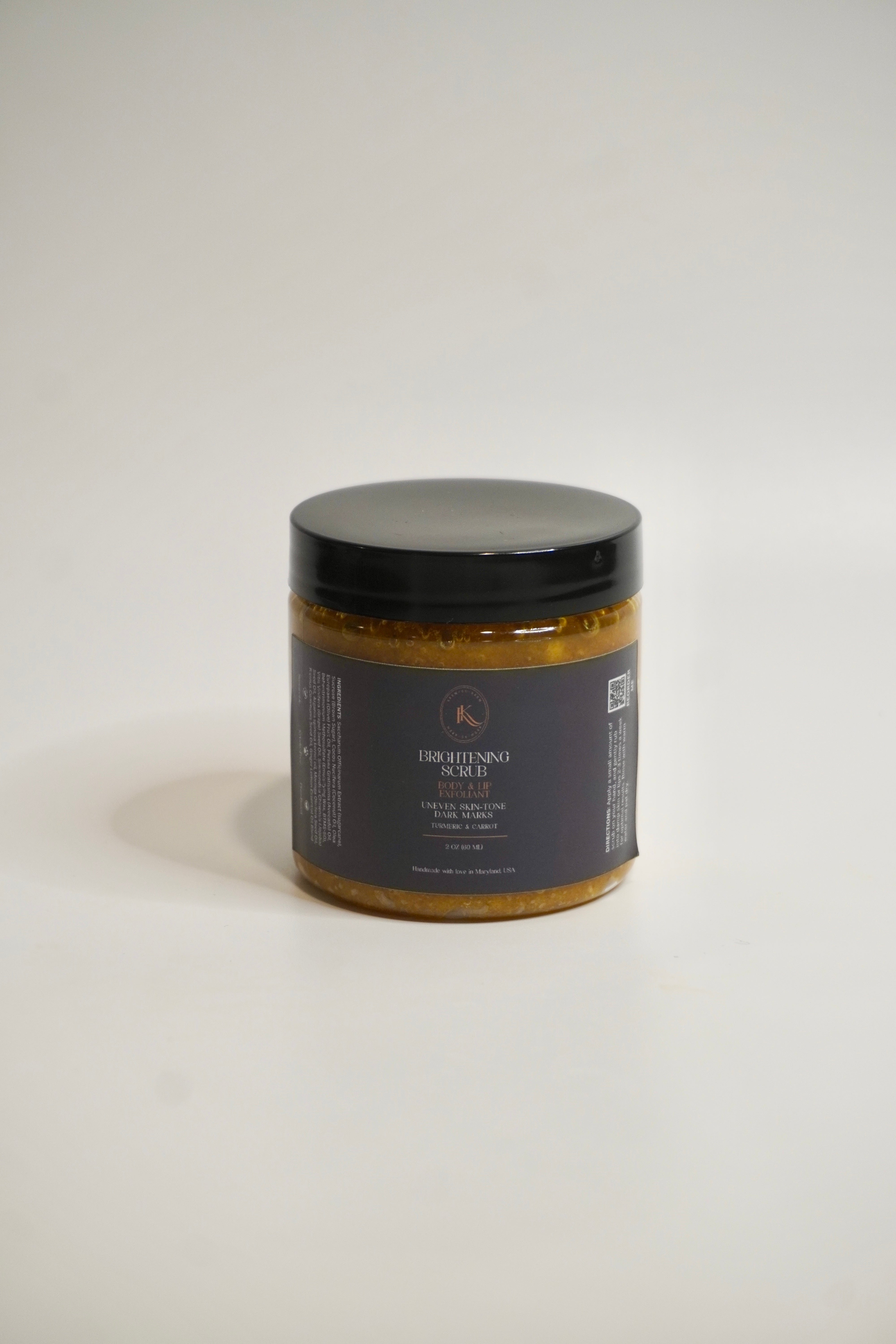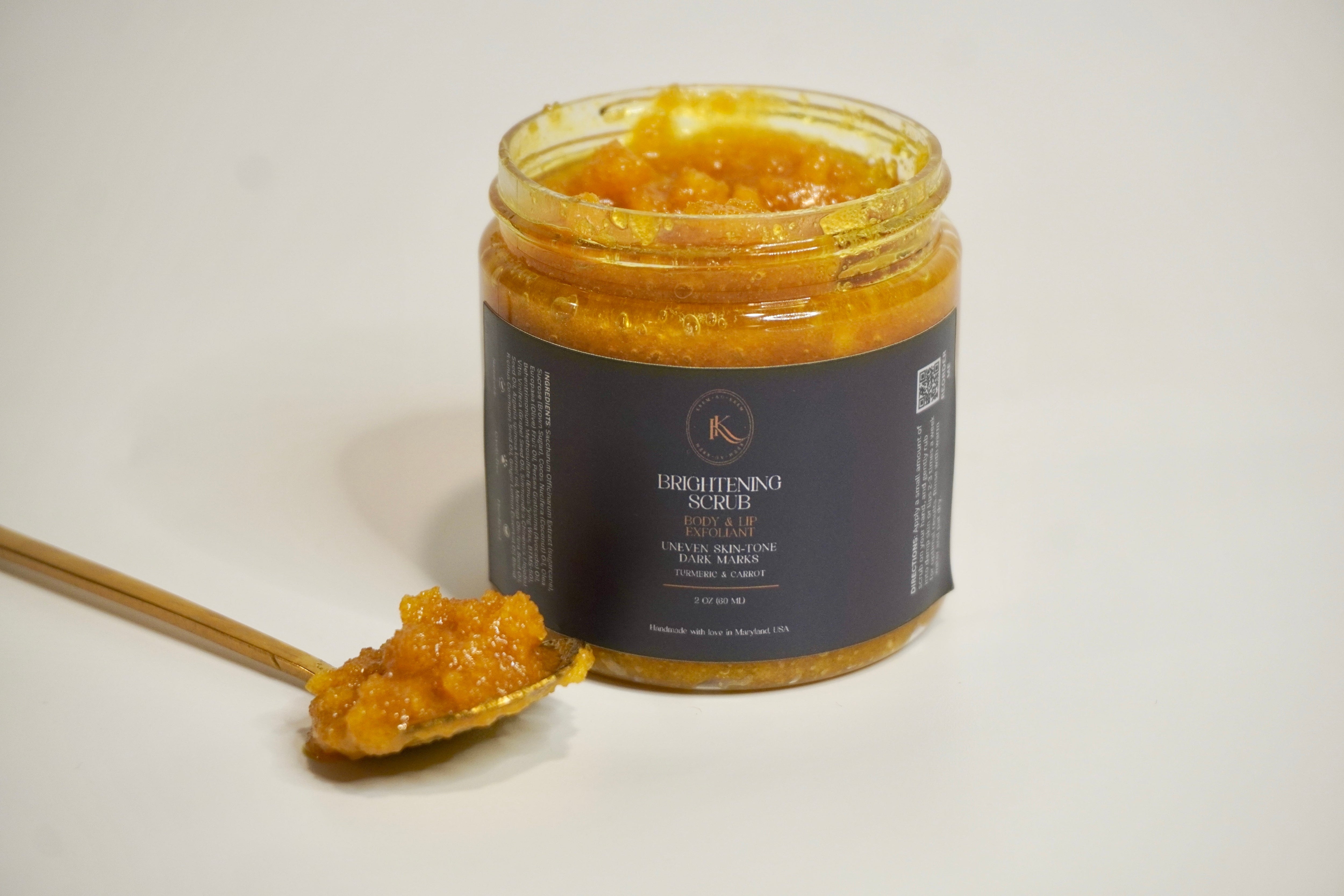 Handmade Turmeric and Carrot Powder infused Brightening Scrub. Used to even skin tones and fade dark marks over time with its powerful plant properties and gentle exfoliation. Great for smoker lips, dark underarms, bikini lines and any area you need a little pick me up, except for your face.